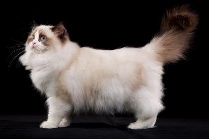 後肢的肌肉發達,關節角度合理,使牠們能夠輕鬆地做出快速的轉向與跳躍。布偶貓的尾巴長且蓬鬆,自然延伸至臀部位置,隨著動作優雅地擺動,增添了牠們的魅力與氣質。整體身體輪廓呈現輕微的矩形,結合圓潤的頭部與蓬鬆的毛髮,展現出布偶貓柔和而親切的外觀,充分展現出牠們的友善性格與穩定的運動能力。