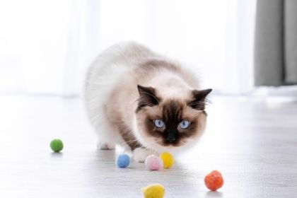 - 玩耍與遊戲:布偶貓對羽毛棒、球和其他捕捉玩具特別感興趣,這些活動能激發牠們的獵捕本能,他們也喜歡在玩具隧道中探險,這能提供牠們安全的遊玩空間,並增加運動量。